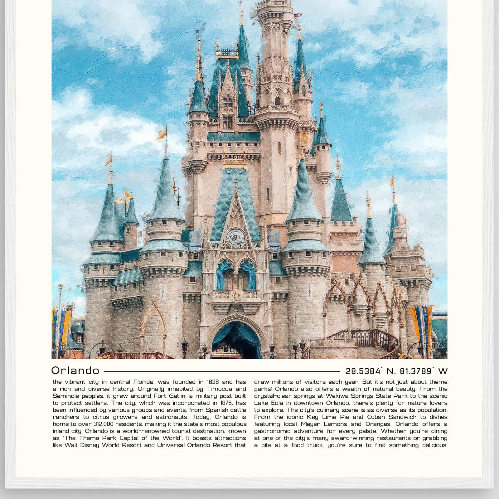 Orlando, Florida digital oil painting wall art is created using a high-tech process that combines the beauty of traditional oil painting with the convenience of digital technology. This process allows artists to create detailed and realistic paintings that are still affordable and easy to care for.