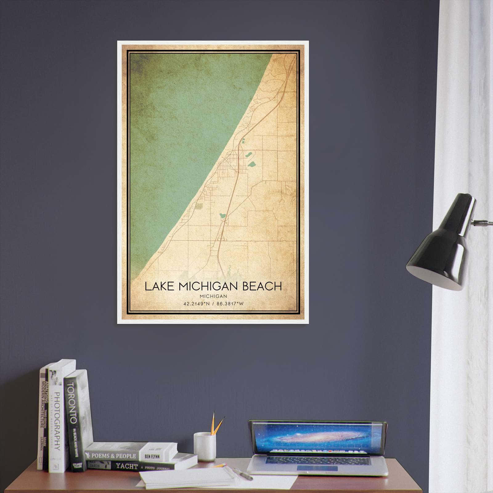 Transform your home decor with this stunning Vintage Lake Michigan Beach Map Poster. This high-quality paper print features a detailed street map of Lake Michigan Beach, making it a perfect addition to your modern home decor collection. Whether you’re born in Lake Michigan Beach or a visitor to the city, this map poster is a great way to explore and navigate the city.