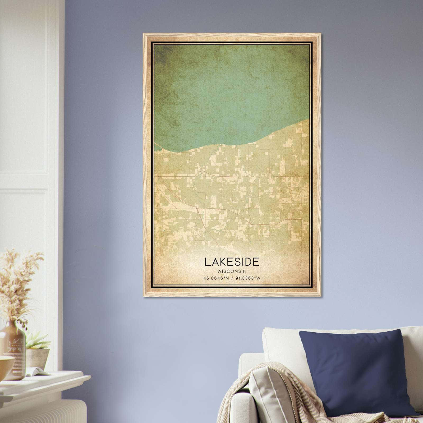 Vintage Lakeside Wisconsin Map Poster, Lakeside WI City Road Wall Art Print