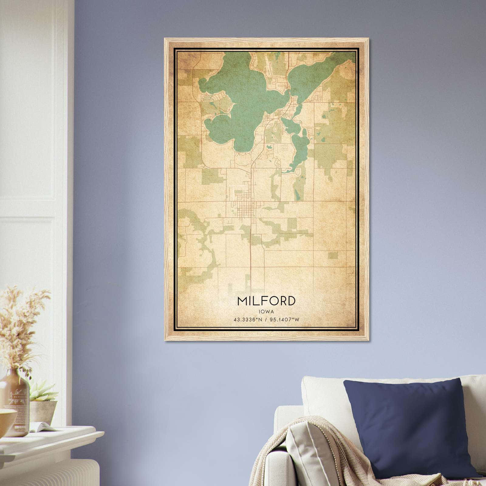 Vintage Milford Iowa Map Poster, Milford IA City Road Wall Art Print